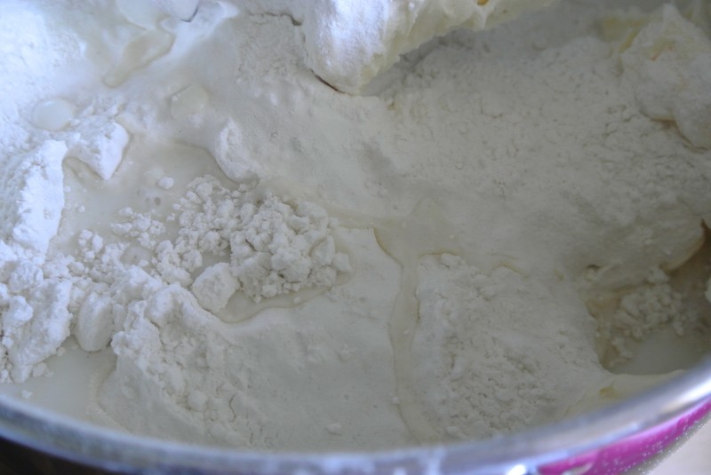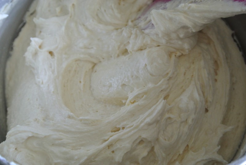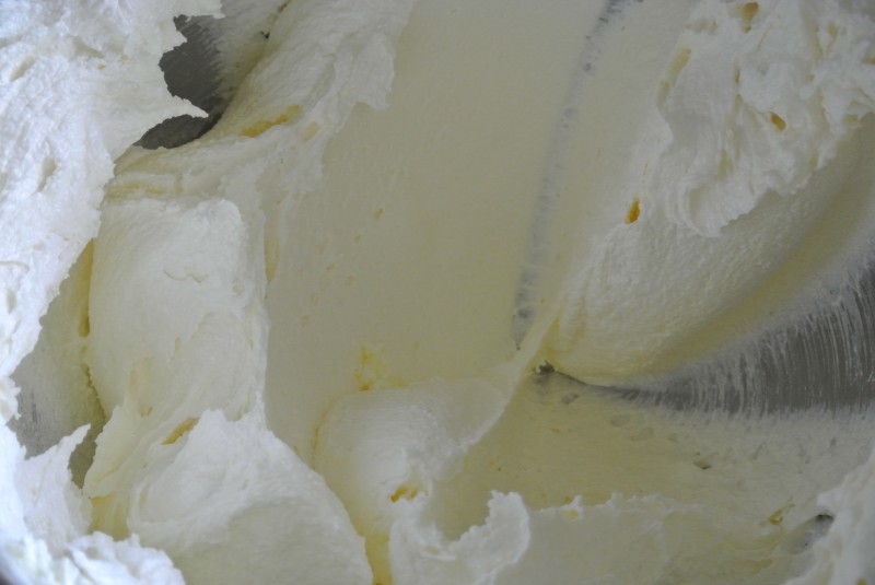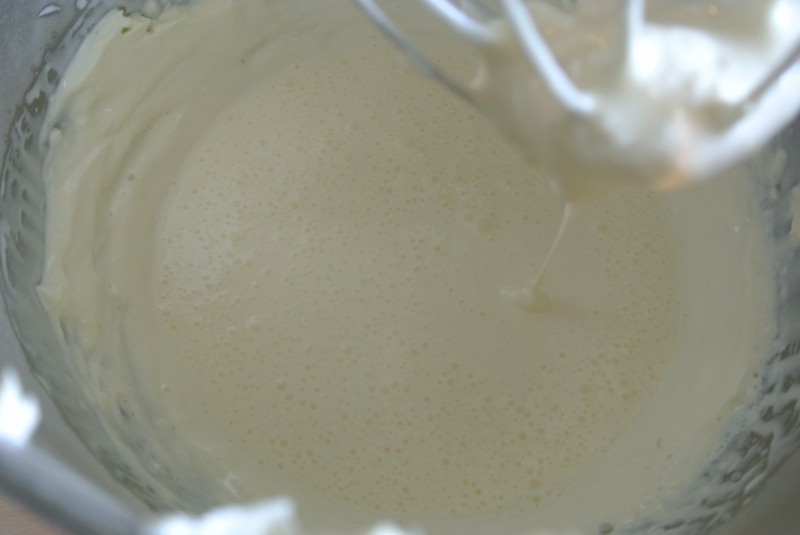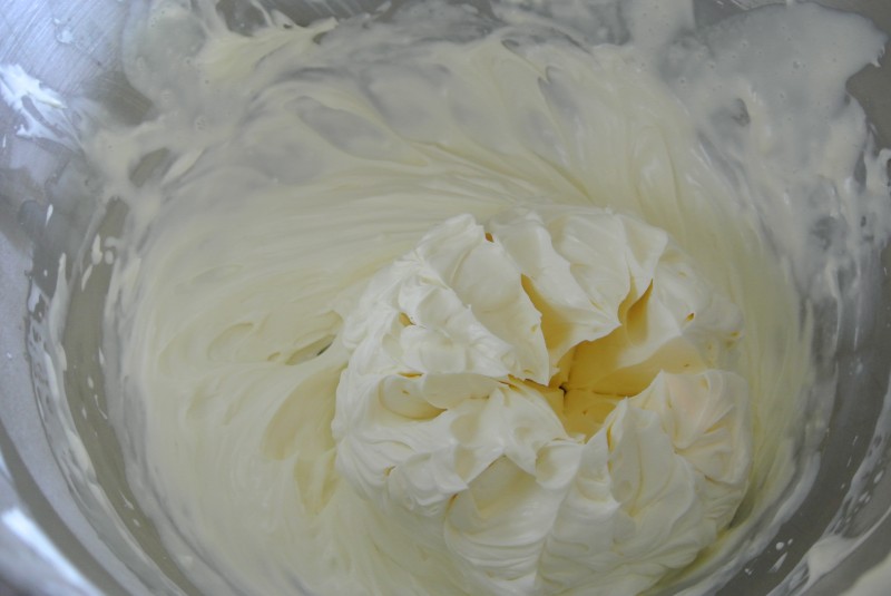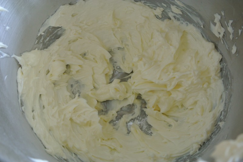Now to add the cream, a little at a time to begin with to loosen the cream cheese mixture. Stop and scrape down the bowl just to make sure all the cream cheese is being mixed.