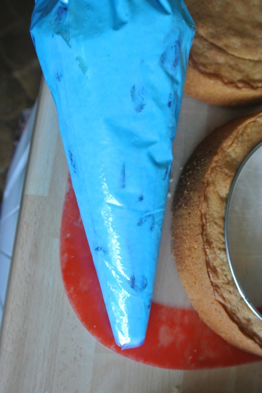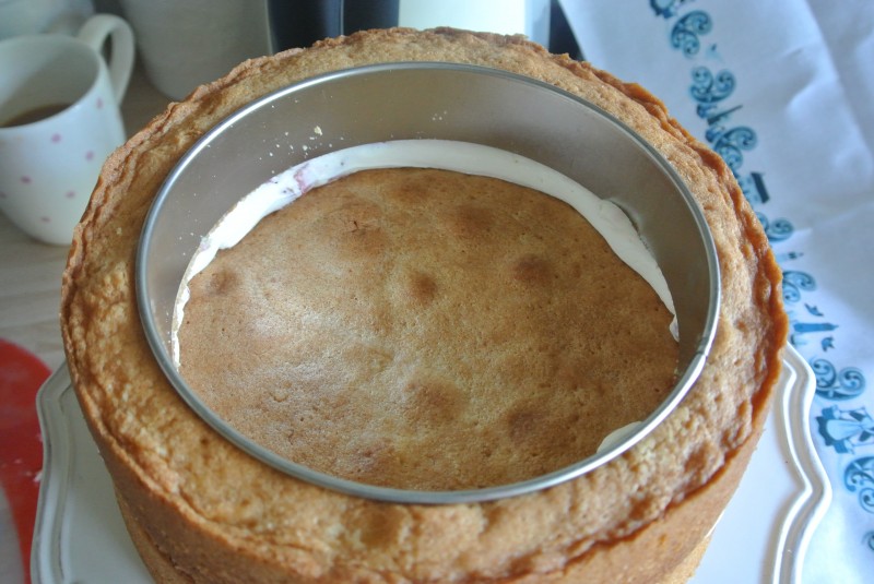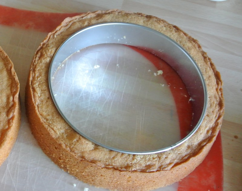 Cut out a 6” circle from the centre one of the cakes. If you don’t have a pastry cutter that size a sharp knife will do the trick.